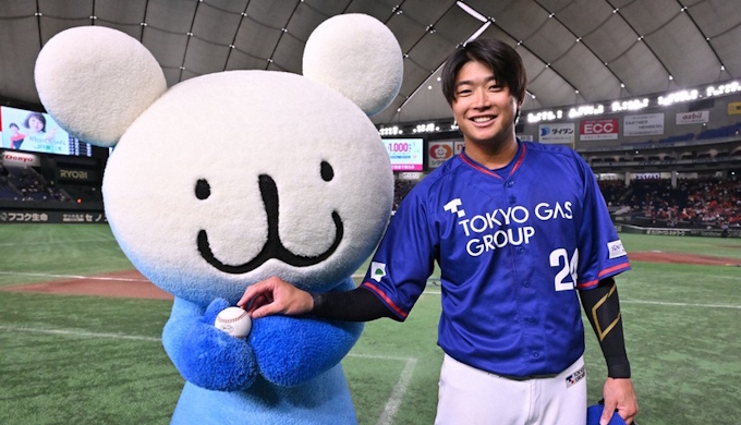 【写真】2024年の都市対抗大会で勝利球を手にする東京ガスの笹川晃平選手(右)とダイヤモンドサポーター「パッチョ」=東京ドームで2024年7月26日
